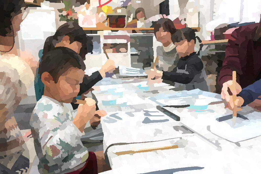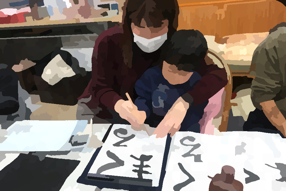 2026年1月11日(日)は新年初回のてらこやでした。午前中は書き初めをしました。水習字の用紙でとめ・はね・はらいの練習をして、書きたい文字を決めて、墨汁で半紙に書いていきます。選んだ言葉にも、個性があらわれます。