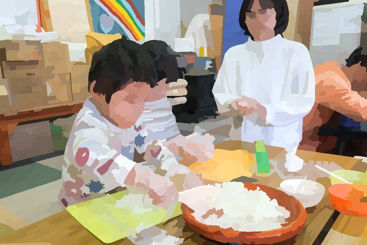 2026年3月8日(日)は今年度最後の「てらこやeトコ」でした。この日は防災クイズでライフラインや飲食料、トイレのことなどを学んだ後で、自分がお昼に食べるおにぎりをつくりました。手袋もして、具材を選んでにぎります。昼ご飯の具沢山味噌汁には、去年にeトコで作ったお味噌を使い始めました。